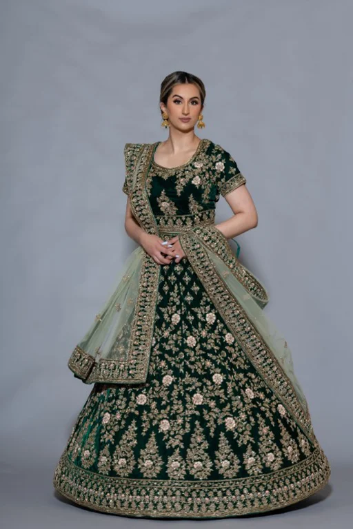 Afgan Green Velvet Bridal Heavyily Embroidered Lehnga Paired with Mint Green Net Embroidered Dupatta